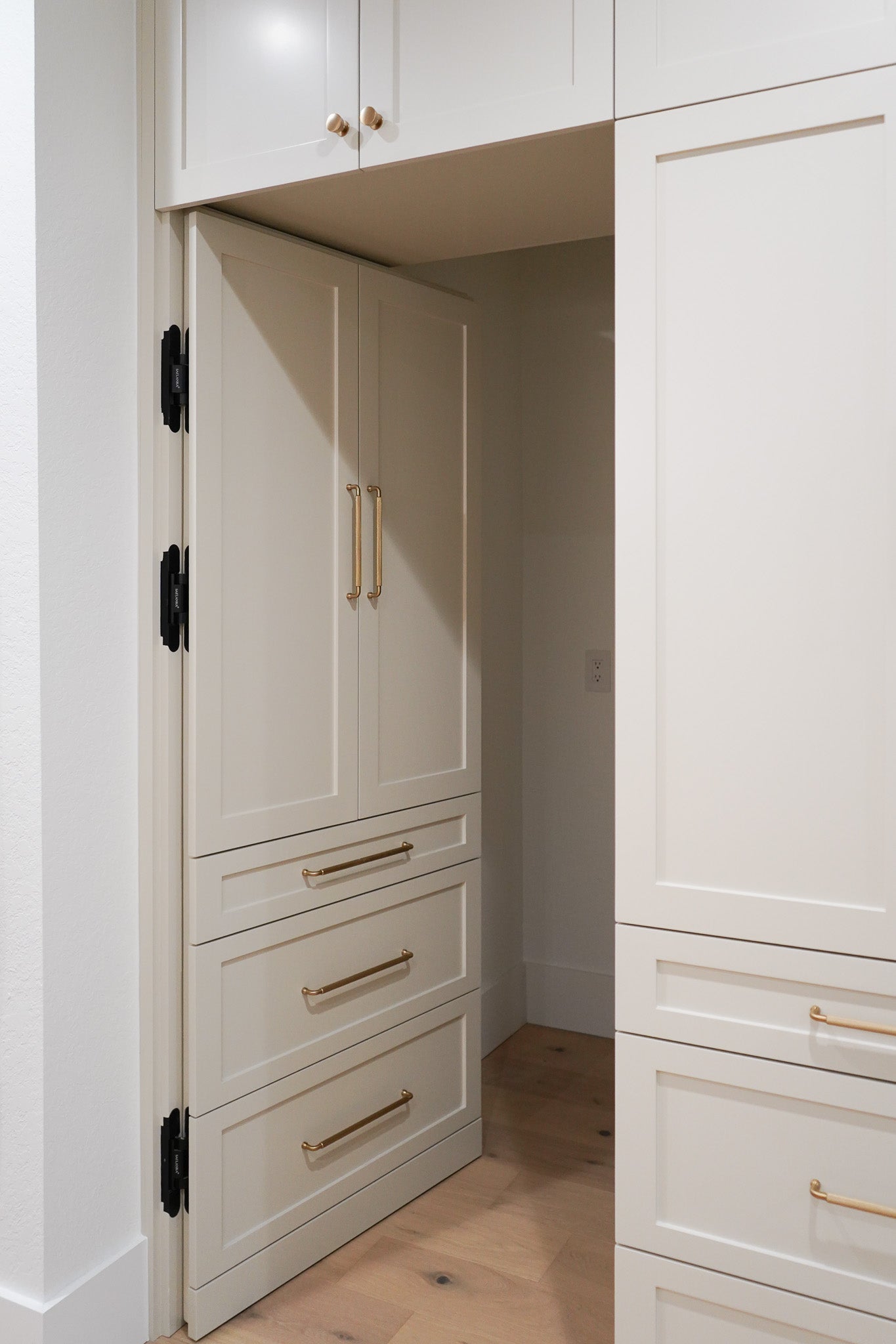 Custom cabinetry designed to conceal pantry storage behind full-height doors for a seamless kitchen appearance. Built with precise detailing to integrate storage while maintaining clean, uninterrupted lines.